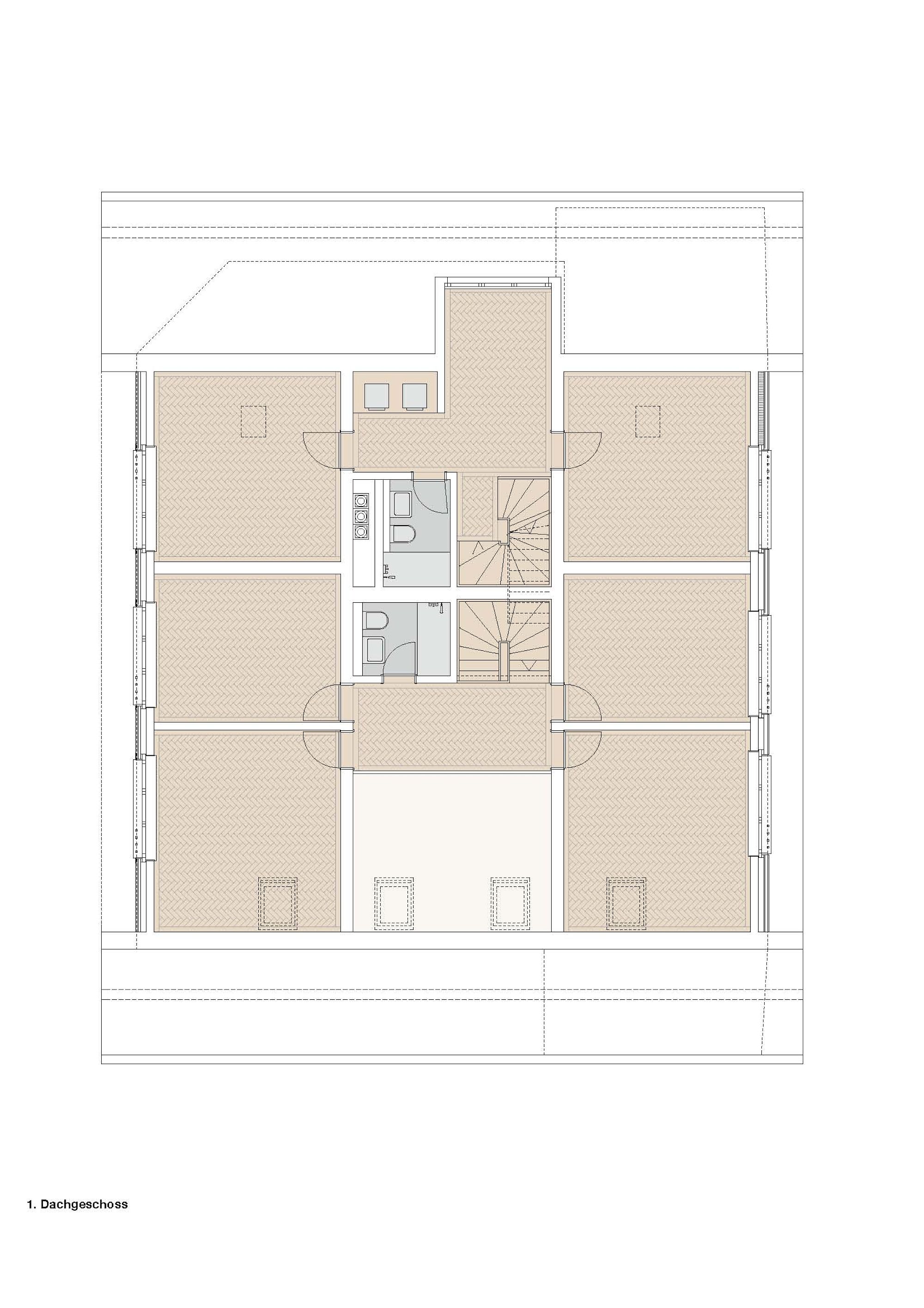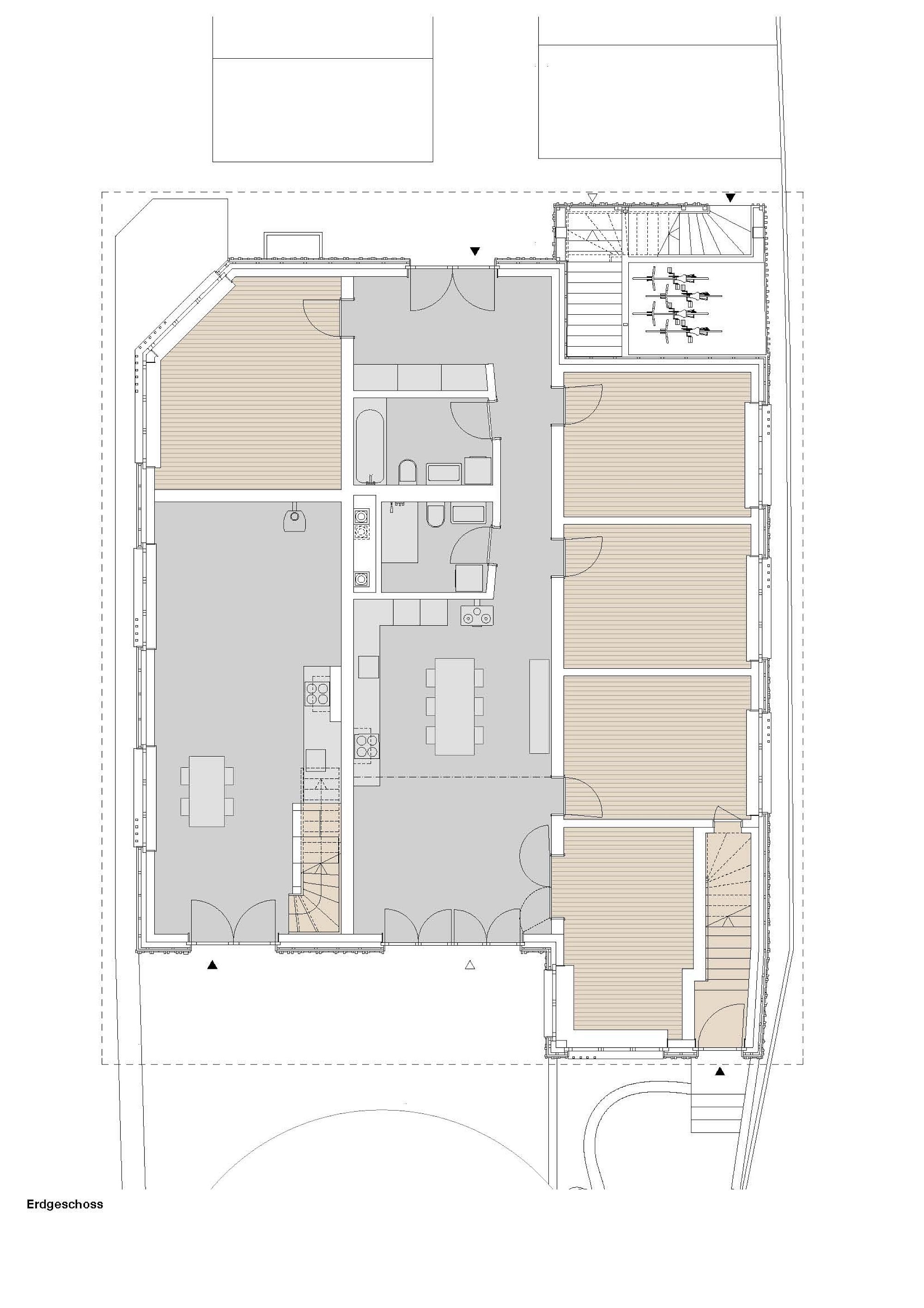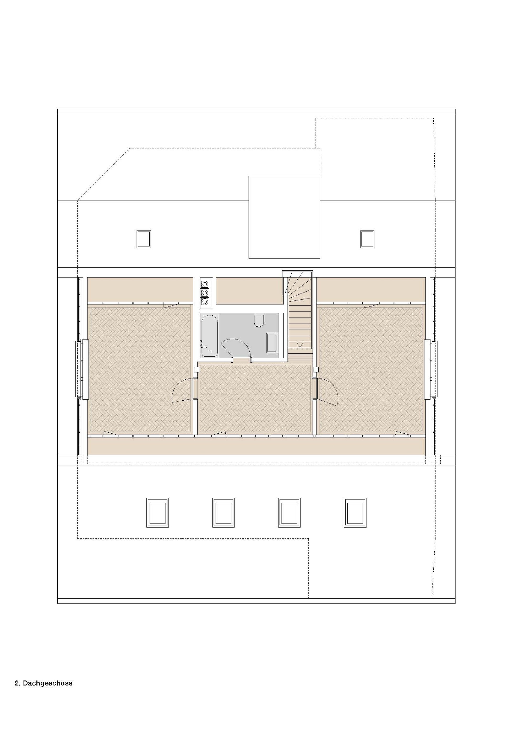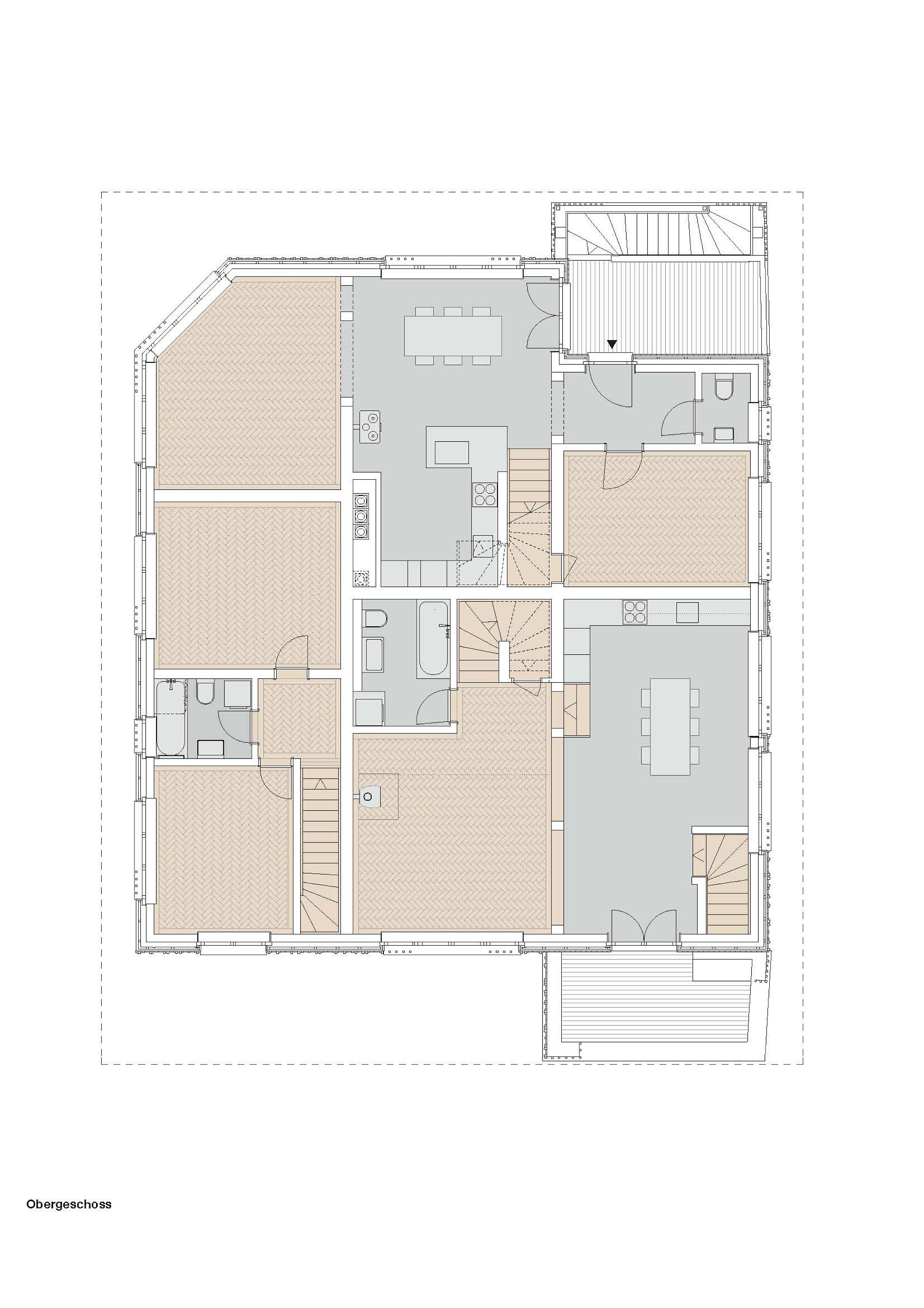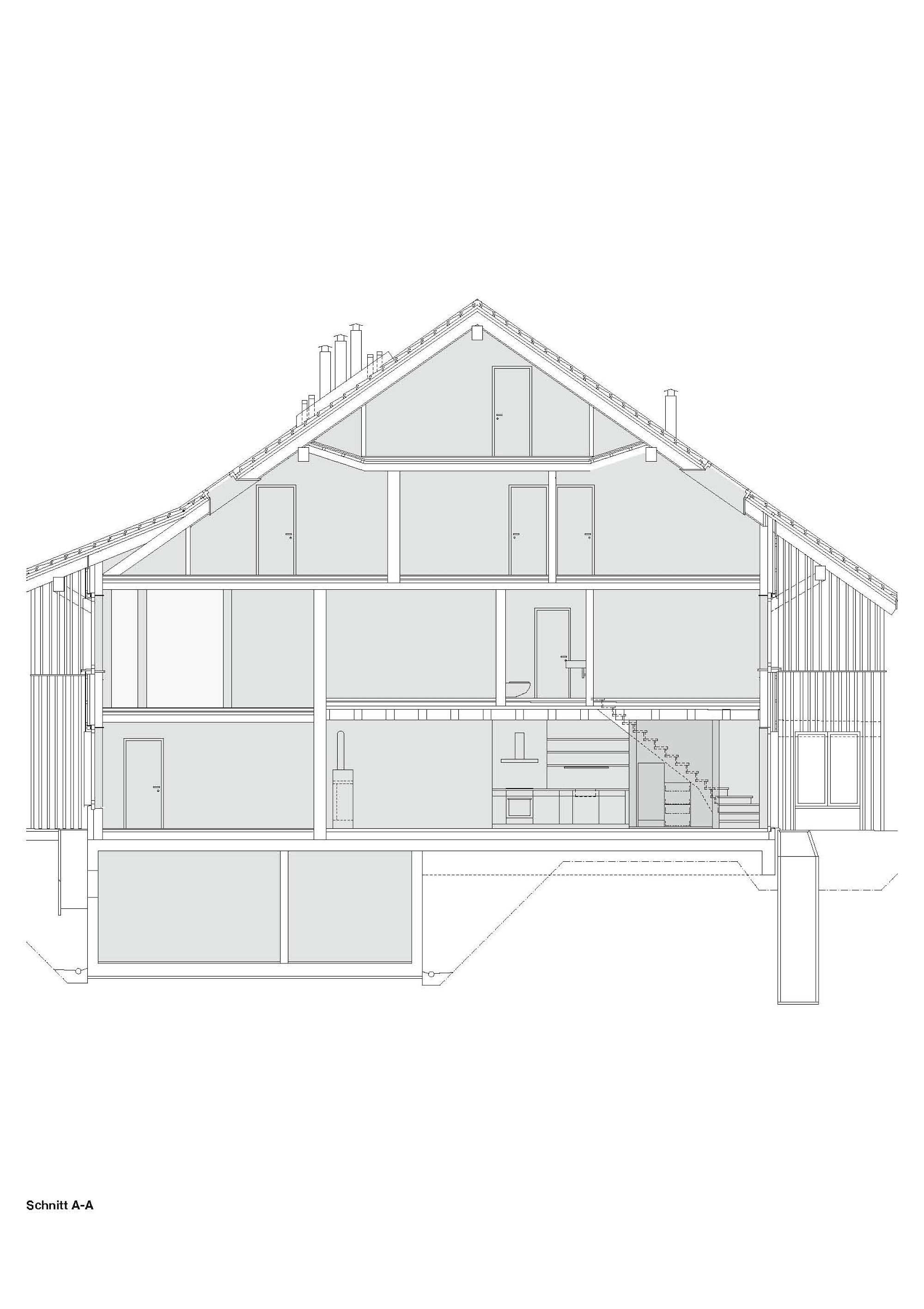 Entsprechend der Scheune verfügt das Haus über mehrere Zugänge. Jede Wohnung hat einen separaten Aussenzugang. Die Raumhöhen innerhalb der Wohnungen sind unterschiedlich. Auch dies ein Bezug zur Scheune, bei welcher die Geschosshöhen dem Zweck angepasst waren. So sind nun beim Neubau die Wohn- und Essräume höher als üblich.