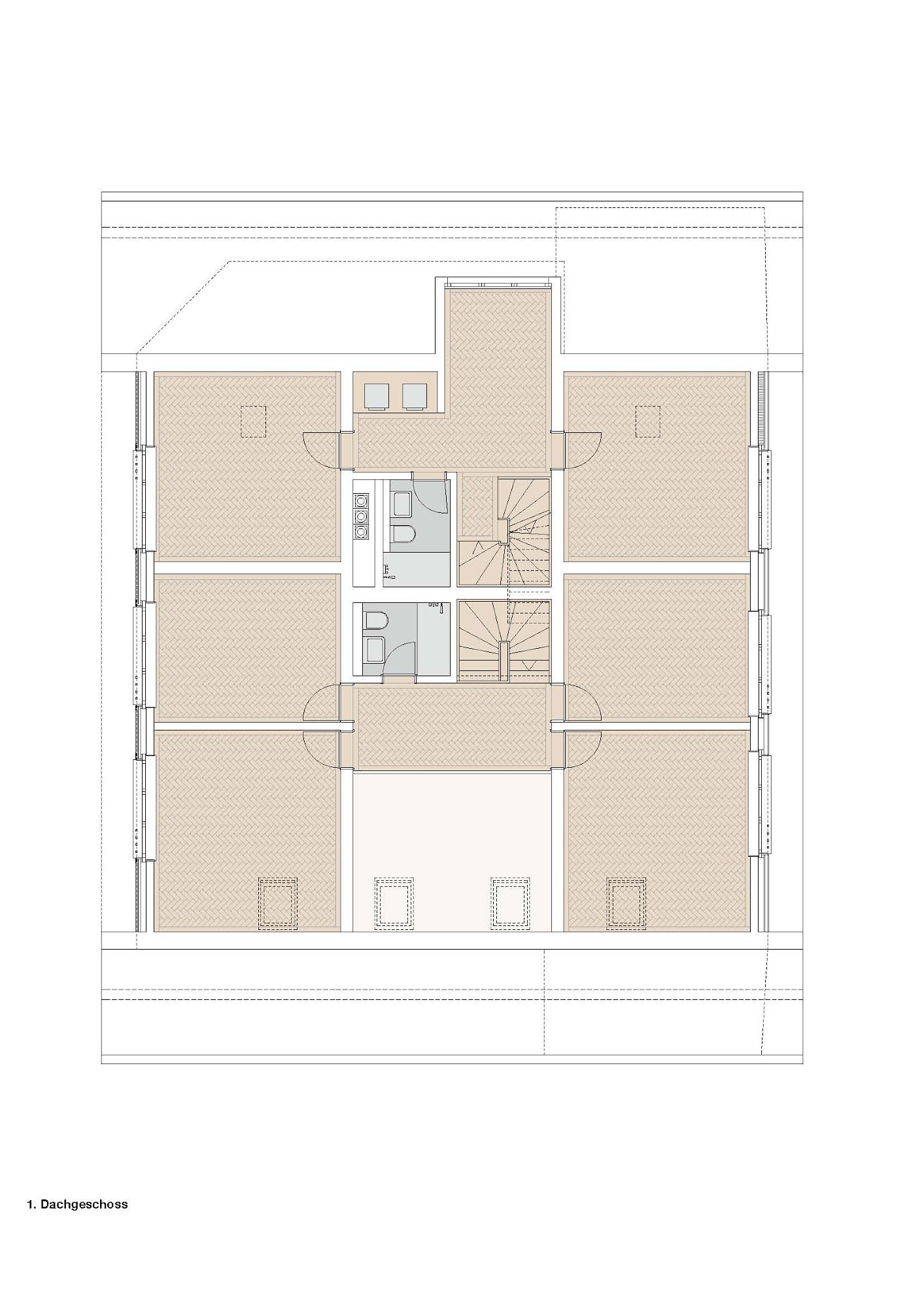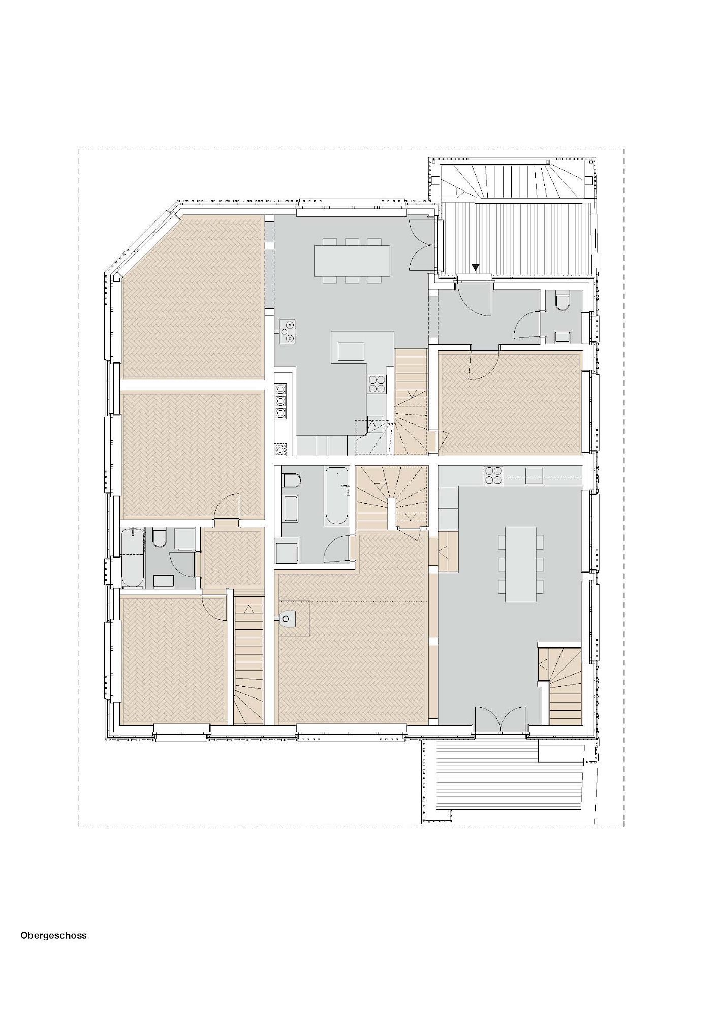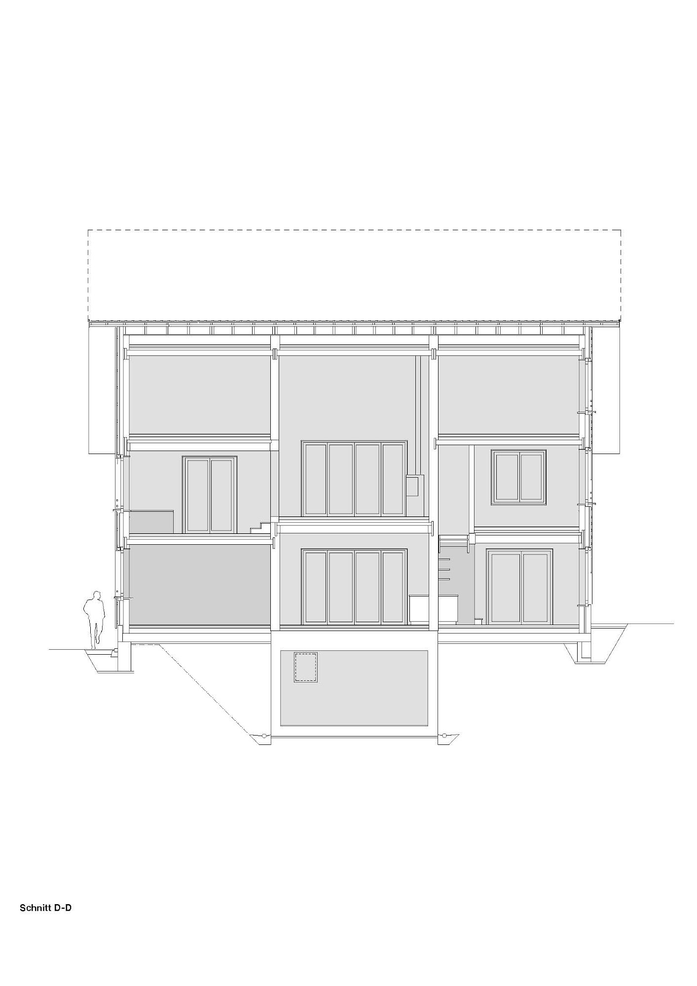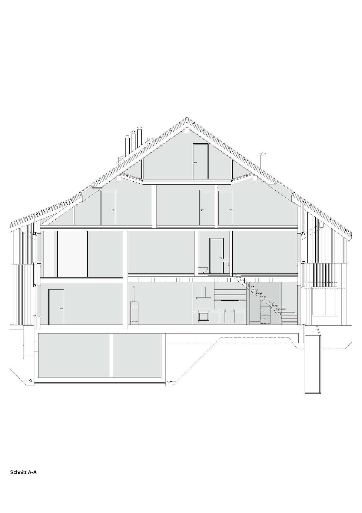 Entsprechend der Scheune verfügt das Haus über mehrere Zugänge. Jede Wohnung hat einen separaten Aussenzugang. Die Raumhöhen innerhalb der Wohnungen sind unterschiedlich. Auch dies ein Bezug zur Scheune, bei welcher die Geschosshöhen dem Zweck angepasst waren. So sind nun beim Neubau die Wohn- und Essräume höher als üblich.
